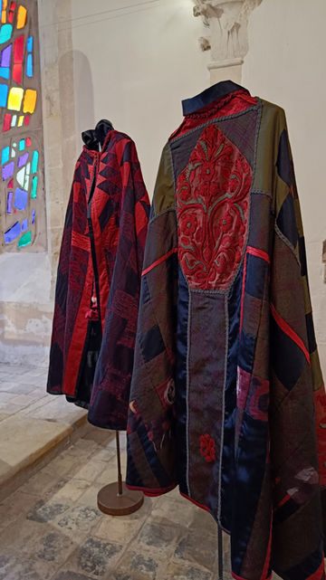 and his guests. The characters, modeled by Eric Chambon, emerge from the depths of the ages where the Heroes merge with the Gods and the monks with their Savior, lead us towards an unknown future and finally, in the depths of the princely trunks, the silk capes of Hélène Jospé that Tancred will wear before the papal altar and the embroideries of Sabine Feliciano, Penelope with fairy fingers who embroiders for eternity what the Fates wanted to destroy. Delicate Odonata caressed by a wave, ephemeral tenant of the palace fountain, born from the hand of Olivia Ferrand.